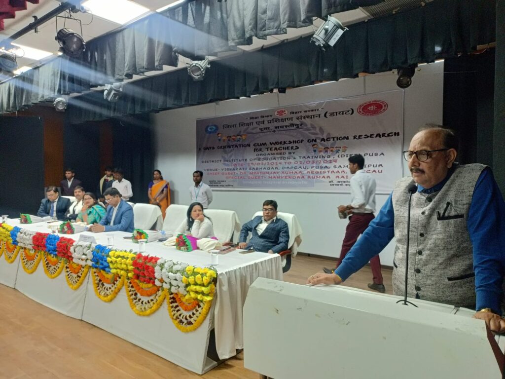 पूसा डा राजेन्द्र प्रसाद केंद्रीय कृषि विश्वविधालय स्थित विद्यापति सभागार में जिला शिक्षा एवं प्रशिक्षण संस्थान के तत्वाधान में क्रियात्मक शोध आधारित उन्मुखीकरण विषय पर तीन दिवसीय कार्यशाला शुरू हुई। जिसकी अध्यक्षता करते हुए कुलसचिव डाॅ.मृत्युंजय कुमार ने कहा कि बिहार में प्रतिभवान बच्चों की कमी नहीं है। शिक्षकों एवं अविभावकों का प्रथम दायित्व बनता है कि अपने संस्थान के बच्चों को सही दिशा में तरासने का हरसंभव प्रयास करने की जरूरत है। शिक्षक अपनी प्रतिभा व कौशल से बच्चों कोे रूचीकर शिक्षा के साथ भविष्य की जरूरतो के अनुरूप बच्चों को संवारने की बड़ी जिम्मेवारी निभाते है। इसमें एैसे प्रशिक्षण काफी लाभकारी होते हैं। जो लक्ष्य को पूर्ण करने में अहम भूमिका निभाते हैं। डीपीओ मानवेन्द्र कुमार ने कहा कि बीते कुछ वर्षो में समस्तीपुर जिला अपने बेहतर प्रदर्शन से चर्चा में रहा है। इसमें जेएनवी में नामांकन के रजिस्ट्रेशन के मामले में लगातार दो वर्षो तक देश में पहले स्थान पर आना, राज्य स्तर की कई प्रतियोगिताओं में प्रथम स्थान पाना शामिल है। इसे आगे भी जारी रखने की जरूरत है। उन्होंने शिक्षको से कहा कि बच्चों में शिक्षा के प्रति उत्कंठा जागृत करना एक बड़ी कला है। इसे प्रत्येक शिक्षक कों आना चाहिए। उन्होंने आयोजको से कहा कि वे अतिथियो के सम्मान के लिए बुके के बदले बुक देने के सिस्टम को प्रभावी बनाये। प्रशिक्षुओं से कहा कि वे कार्यशाला में प्राप्त ज्ञान के बाद इसका फीडबैक व आगामी वर्क प्लान से अवगत कराने की जरूरत है। समारांेह की अध्यक्षता प्राचार्य डाॅ.आकांक्षा कुमारी, संयोजन समन्वयक प्रशांत भास्कर एवं संचालन डाॅ.अंकिता ने किया