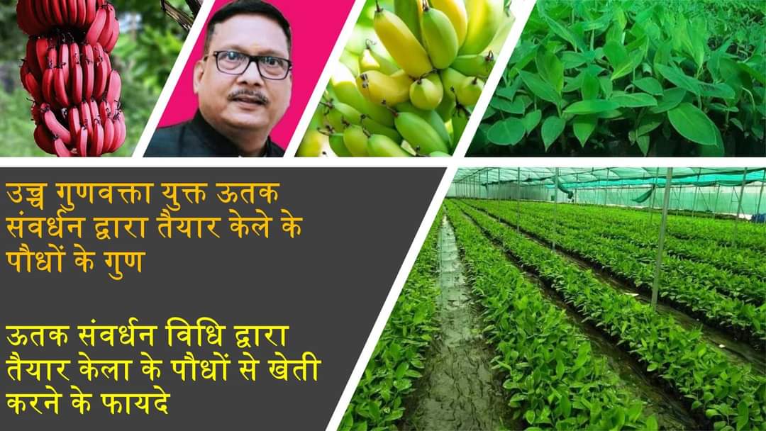 प्रधान अन्वेषक, अखिल भारतीय समन्वित अनुसंधान परियोजना(फल) ने बताया कि विगत कुछ वर्षो से ऊतक संवर्धन (टिसु कल्चर) विधि द्वारा केले की उन्नत प्रजातियों के पौधे तैयार किये जा रहे हैं। इस विधि द्वारा तैयार पौधों से केलों की खेती करने के अनेकों लाभ हैं। ये पौधे स्वस्थ एवं रोग रहित होते है। पौधे समान रूप से वृद्धि करते है। अतः सभी पौधों में पुष्पन, फलन एवं घौद की कटाई एक साथ होती है, जिसकी वजह से विपणन में सुविधा होती है।