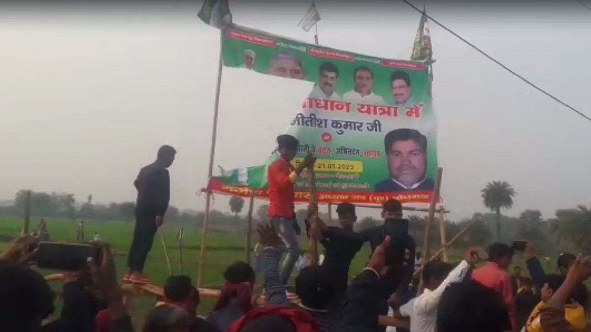 सीएम नीतीश उद्घाटन किए बिनका ही बोधगया महाबोधि सांस्कृतिक केंद्र आ गये। जहां मुख्यमंत्री समीक्षा बैठक की। प्रशासन ने अभी इसकी पुष्टि नहीं की है लेकिन इस तरह का एक वीडियो वायरल हो रहा है। वायरल वीडियो में बैनर को फाड़ा जा रहा है। उस पर समाधान यात्रा के तहत मुख्यमंत्री नीतीश कुमार के आने को लेकर जानकारी लिखी है। इसके साथ ही इस बैनर पर अंकित तारीख 21 जनवरी 2023 साफ दिखाई पड़ती है। कुछ लोग इसके सामने हाथों में लाठी लेकर खड़े हैं। इसके बाद भारी शोर के बीच इसे फाड़ दिया जाता है।