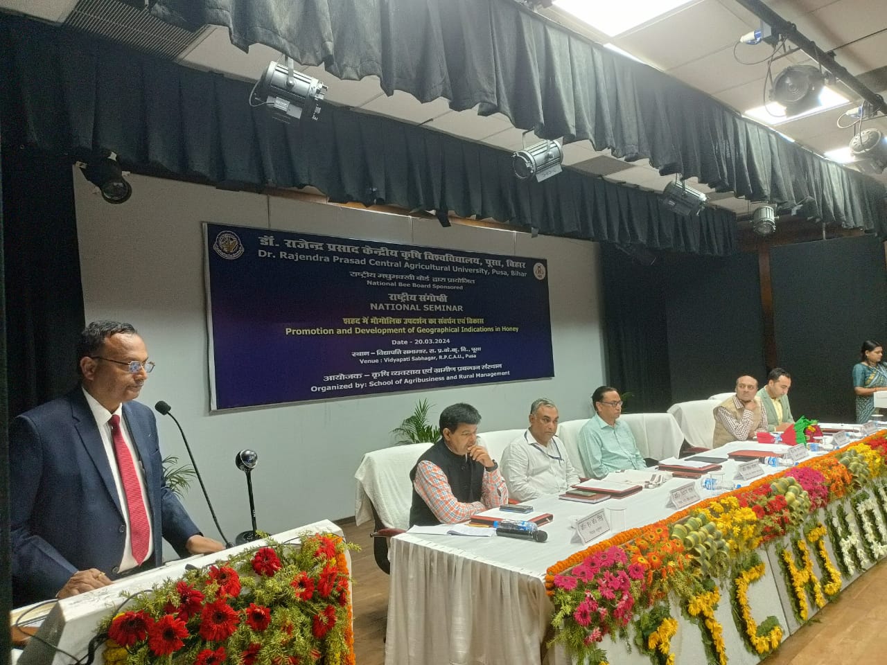 समस्तीपुर पूसा डॉ राजेन्द्र प्रसाद केन्द्रीय कृषि विश्वविधालय स्थित विद्यापति सभागार में राष्ट्रीय मधुमक्खी बोर्ड प्रायोजित शहद में भौगौलिक उपदर्शन का संवर्धन एवं विकास विषय पर राष्ट्रीय संगोष्ठी आयोजित की गई। जिसकी अध्यक्षता करते हुए कुलपति डॉ.पीएस पाण्डेय ने कहा कि भगवान बुद्ध की ज्ञानस्थली बिहार ने मधु क्रांति लाने की दिशा में अग्रसर हो चुका है। इस कड़ी को सशक्त और धारदार बनाने के लिए सरकार व विवि के साथ मधु उत्पादको की सामूहिक सहभागिता जरूरी है। शाही लीची की गुणवत्तायुक्त शहद पर जीआई टैग लगवाने का जोरदार प्रयास किया जा रहा है। जो फिलवक्त इसी का एक अहम हिस्सा है। जिसके सहयोग एवं विवि की ब्रांड इमेज से यहां की शहद एक हजार से भी अधिक प्रति किलो की दर से बेचने की योजना पर कार्य प्रारंभ हो चुका हैै। इसके लिए इसके गुण व विशेषताओं से पहचान बनाने के साथ ही उसकी गुणवत्ता राष्ट्रीय व अर्न्तराष्टीय स्तर की मानक पर खड़ा उतारने की जरूरत है। कुलपति डा पांडेय ने बुधवार को विवि के विद्यापति सभागार में मधु उत्पादक समूहो, किसानो, छात्रों व वैज्ञानिको को संबोधित कर रहे थे।