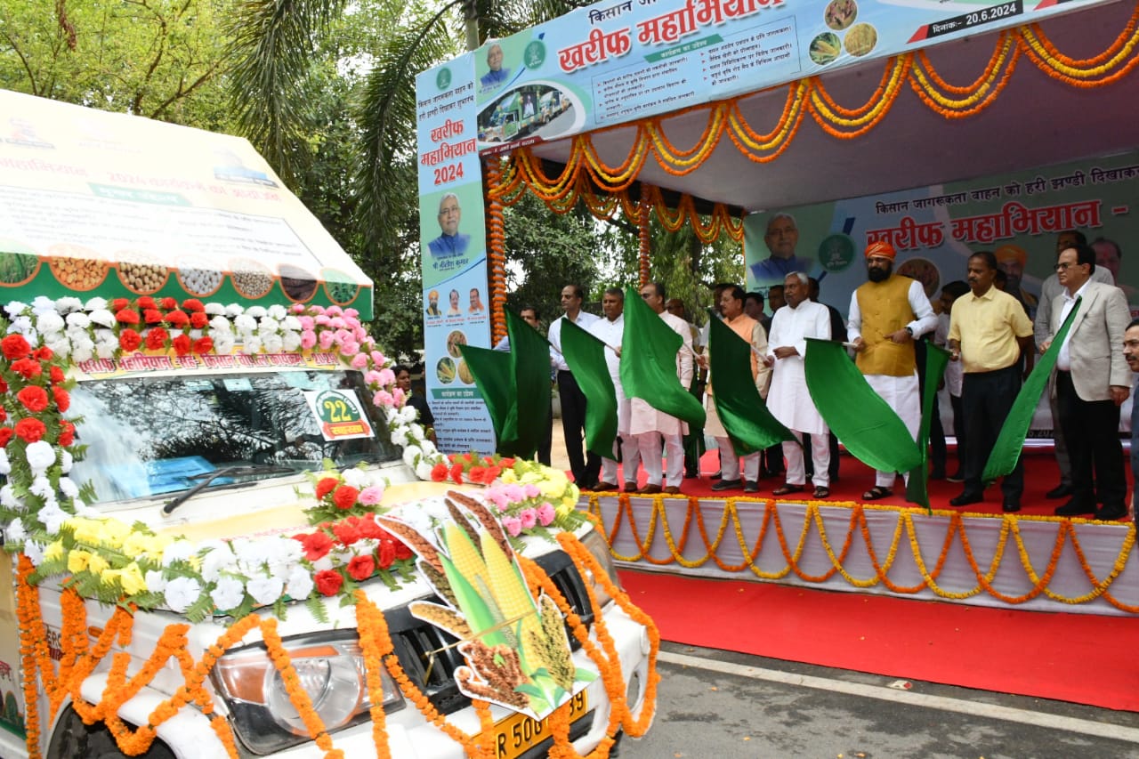 पटना। बिहार की राजधानी पटना में मुख्यमंत्री नीतीश कुमार ने गुरुवार को 01 अणे मार्ग से खरीफ महाभियान-2024 का शुभारंभ किया। इस अवसर पर मुख्यमंत्री ने खरीफ महाभियान-2024 के तहत सभी जिलों के लिए किसान जागरूकता वाहनों को हरी झंडी दिखाकर रवाना किया। इस कार्यक्रम का उद्देश्य है कि किसानों को कृषि विभाग द्वारा संचालित विभिन्न योजनाओं की जानकारी देकर उन्हें जागरूक किया जाय। इन किसान जागरूकता वाहन के माध्यम से किसानों को खरीफ फसलों की तकनीकी जानकारी एवं खरीफ मौसम में कृषि विभाग द्वारा संचालित योजनाओं की जानकारी दी जाएगी। साथ ही खरीफ में अनुदानित दर पर उपादान वितरण की जानकारी, फसल अवशेष प्रबंधन के प्रति जागरूकता, जलवायु के अनुकूल कृषि कार्यक्रम से संबंधित जानकारी, जैविक खेती के लिए प्रोत्साहन, फसल विविधीकरण पर विशेष जानकारी, चतुर्थ कृषि रोड मैप के विभिन्न आयामों की जानकारी सहित अन्य कार्यक्रमों का भी प्रचार-प्रसार कर किसानों को जागरूक किया जाएगा। कार्यक्रम की शुरूआत में कृषि विभाग के सचिव श्री संजय कुमार अग्रवाल ने मुख्यमंत्री को हरित पौधा एवं पुष्प गुच्छ भेंट कर स्वागत किया। इस अवसर पर उप मुख्यमंत्री श्री सम्राट चौधरी, उप मुख्यमंत्री श्री विजय कुमार सिन्हा, कृषि मंत्री श्री मंगल पाण्डे, जल संसाधन मंत्री श्री विजय कुमार चौधरी एवं सभी वरीय पदाधिकारी उपस्थित थे।