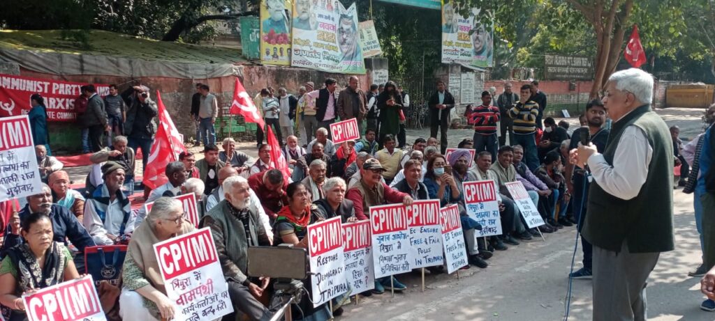 नई दिल्ली । सीपीआईएम दिल्ली एनसीआर राज्य कमेटी के कार्यकर्ताओं ने जंतर मंतर नई दिल्ली पर से त्रिपुरा की जनता के साथ एकजुटता में और निष्पक्ष चुनाव करवाने की मांग को लेकर धरना प्रदर्शन किया।