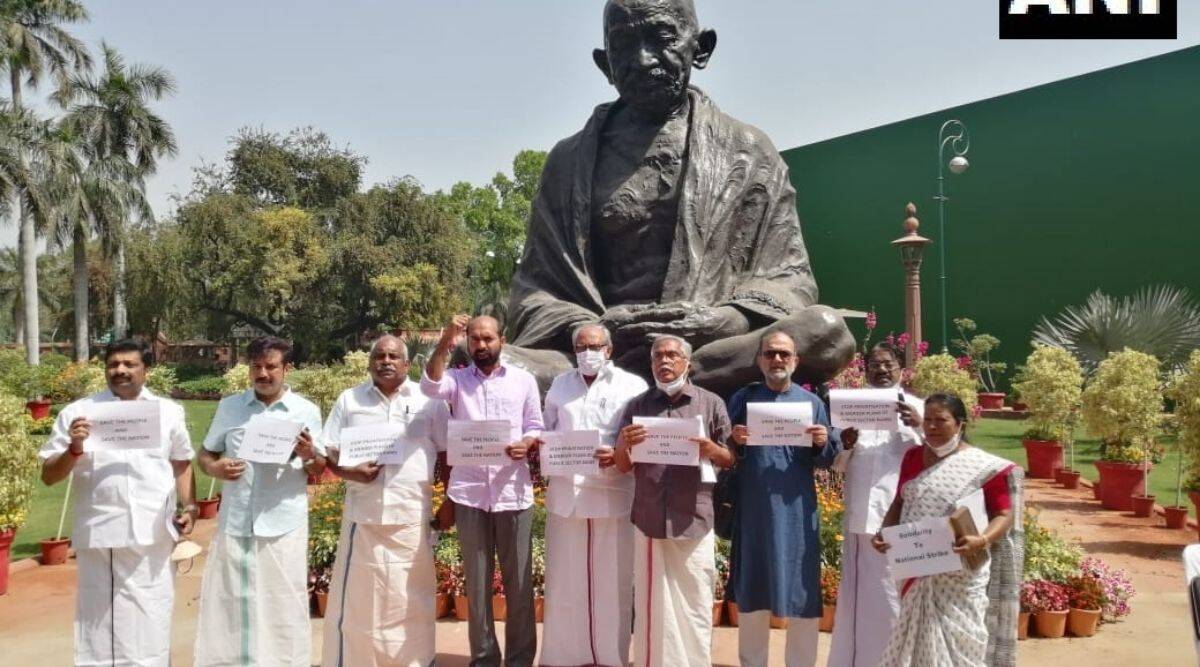 भारत बंद के समर्थन में संसद में गांधी प्रतिमा के सामने डीएमके और लेफ्ट के सांसदों ने प्रदर्शन किया। पश्चिम बंगाल के जादवपुर में प्रदर्शनकारियों ने रेलवे ट्रैक को बाधित किया