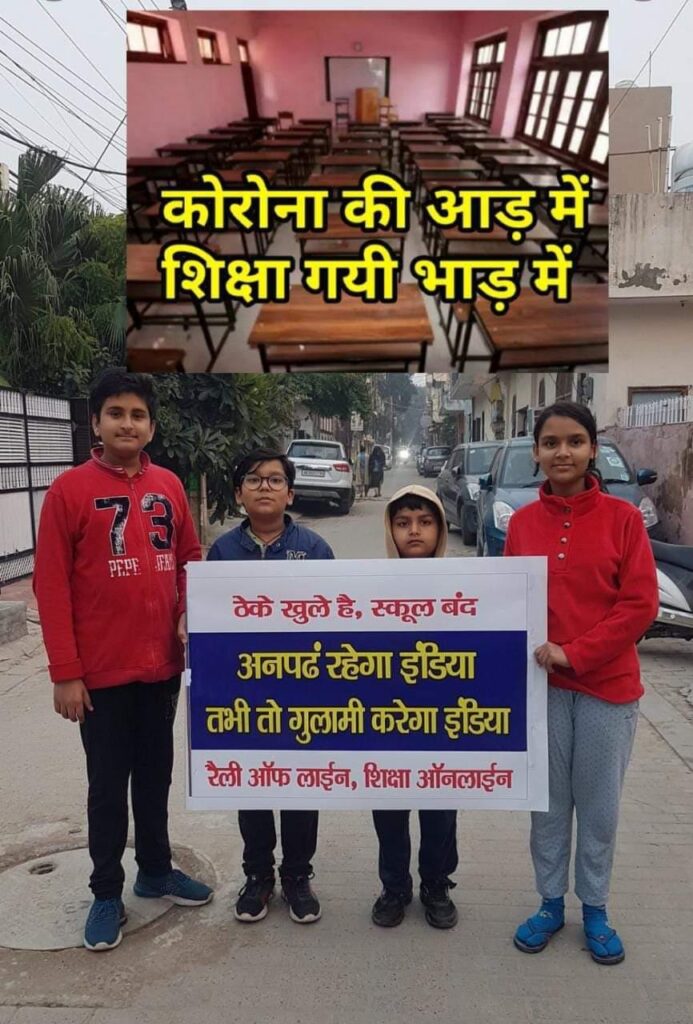 ऐसे में प्रश्न उठता है कि यदि इस तरह से स्कूल बंद रहे तो देश की शिक्षा व्यवस्था का क्या होगा ? ऐसे में जगह-जगह अपने-अपने हिसाब से बच्चों ने स्कूलों के बंद करने का विरोध करना भी शुरू कर दिया है। इन सबके बीच सोशल मीडिया पर एक बैनर लिये चार बच्चों का एक फोटो खूब वायरल हो रहा है। इन बैनर पर लिखा है ‘कोरोना की आड़ में शिक्षा गई भाड़’ ‘ठेके खुले हैं, स्कूल बंद’। ‘अनपढ़ रहेगा इंडिया तभी तो गुलामी करेगा इंडिया’, ‘रैली ऑफ लाइन, शिक्षा ऑनलाइन’। इन स्लोगों के लिखा यह बैनर देश और समाज को एक बड़ा संदेश दे रहा है।
