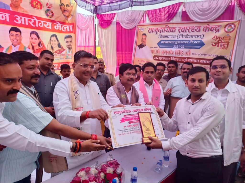 सीएमओ डॉ प्रेमी ने कि 2021-22 में कायाकल्प पुरस्कार योजना के अंतर्गत सिरसागंज सामुदायिक स्वास्थ्य केंद्र को कायाकल्प पुरस्कार विजेता बनने पर सभी स्वास्थ्य कर्मियों को बधाई दी तथा पुरस्कार वितरित किए।