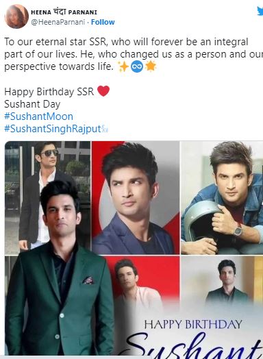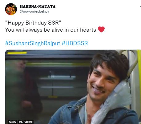 फैंस ने सुशांत को उनके जन्मदिन पर याद करते हुए उनकी पुरानी फोटोज और वीडियोज को शेयर करते हुए उन्हें जन्मदिन की शुभकामनाएं दी है। साथ ही उनका कहना है कि भले ही एक्टर हमें छोड़ कर चले गए है, लेकिन आज भी उनके फैंस उन्हें याद करते है। सोशल मीडिया पर हैप्पी बर्थडे एसएसआर करके ट्रेंड भी कर रहा हैं। एक हिना चंदा नाम के यूजर ने उन्हें जन्मदिन पर विश करते हुए काफी प्यारा नोट भी लिखा जिसमें उन्होंने लिखा कि हमारे स्टार सुशांत को उनके जन्मदिन पर शुभकामनाएं-