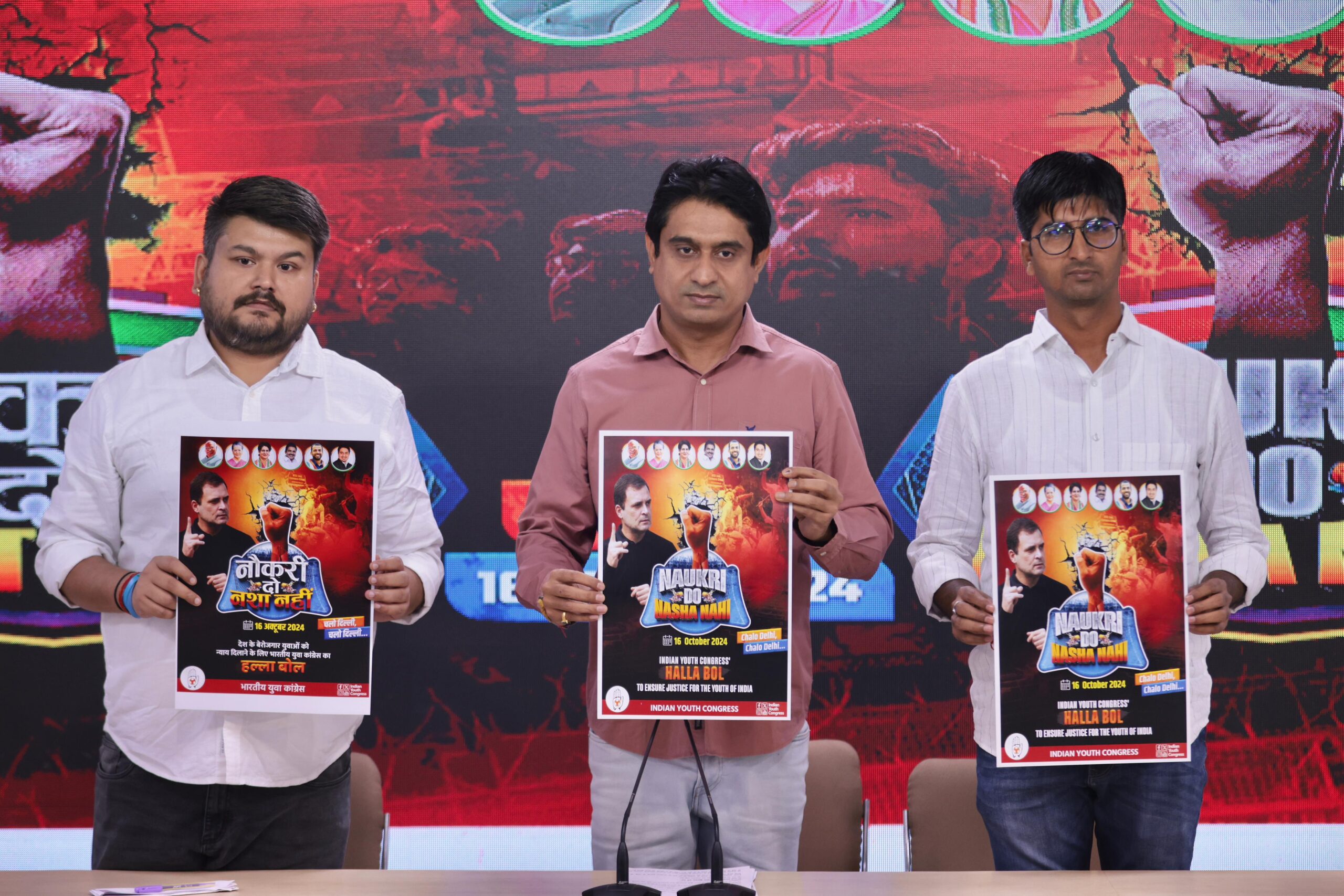 नई दिल्ली। भारतीय युवा कांग्रेस के राष्ट्रीय अध्यक्ष श्री उदय भानु चिब जी ने आज “नौकरी दो, नशा नहीं” कैंपेन के संबंध में पत्रकार वार्ता को संबोधित किया और कैंपेन से जुड़ा पोस्टर लॉन्च किया, एआईसीसी मुख्यालय, दिल्ली में। भारतीय युवा कांग्रेस के राष्ट्रीय अध्यक्ष उदय भानु चिब ने कहा कि केंद्र की मोदी सरकार के पिछले 10 साल में देश के युवाओं को सिर्फ धोखा मिला है, पीएम मोदी का वादा था हर साल 2 करोड़ नौकरियां देंगे, विदेशों से काला धान वापस लाएंगे, क्या हुआ उस वादे का? नौकरियों की जगह युवाओं को नशा मिला है, विदेश से काला धन आने की जगह भारी मात्रा में ड्रग्स आई है। इस धोखे के खिलाफ यूथ कांग्रेस 16 अक्टूबर से एक देशव्यापी मुहिम का आगाज कर रहा है, इसका उद्देश्य है- “नौकरी दो, नशा नहीं”।