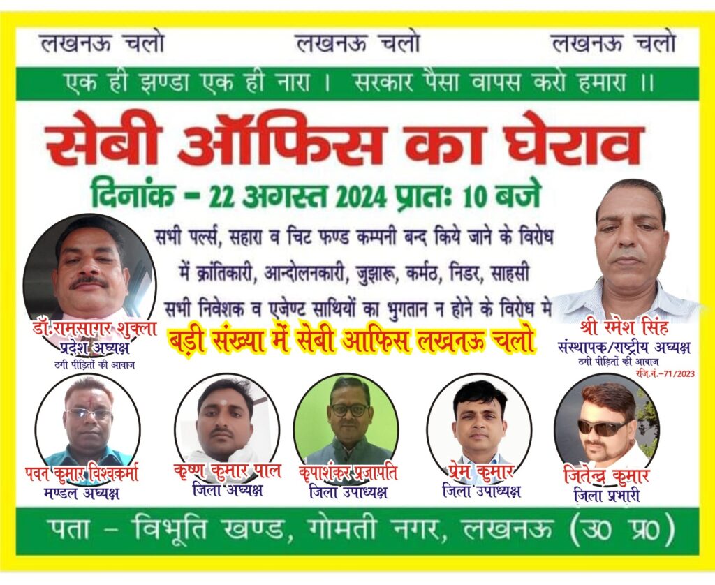 दरअसल 22 अगस्त को ठगी पीड़ितों की आवाज संगठन के बैनर तले लखनऊ के विभूति खंड गोमतीनगर स्थित सेबी के कार्यालय का घेराव किया जाएगा। इस घेराव में विभिन्न चिटफंड कंपनी एवं क्रेडिट कोऑपरेटिव सोसायटी के पीड़ित जमाकर्ता कार्यकर्ता शामिल होंगे। सेबी कार्यालय का घेराव करने वालों में पीएसीएल, साई प्रसाद, विश्वामित्र, साईं प्रकाश डेवलपमेंट को ऑपरेटिव सोसायटी के अलावा और कई कंपनियों के जमाकर्ता कार्यकर्ता भी शामिल होंगे। यह जानकारी ठगी पीड़ितों की आवाज संगठन के राष्ट्रीय अध्यक्ष रमेश सिंह ने दी है।