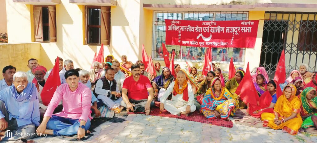 समस्तीपुर । पूसा अखिल भारतीय खेत एवं ग्रामीण मजदूर सभा (खेग्रामस) प्रखंड कमिटी के झंडा बैनर तले प्रखंड मुख्यालय पर खेग्रामस प्रखंड सचिव सुरेश कुमार, पारो देवी को वक्ताओं द्वारा माला पहनाकर अनिश्चितकालीन अनशन शुरू किया गया। तत्पश्चात सभा का आयोजन किया गया। सभा की अध्यक्षता खेग्रामस प्रखंड अध्यक्ष मो. इस्तेखार व संचालन भाकपा-माले प्रखंड सचिव अमित कुमार ने किया। वही अनिश्चितकालीन अनशन में मुख्य वक्ता. खेग्रामस जिला सचिव जीवछ पासवान, खेग्रामस जिला अध्यक्ष उपेन्द्र, माले प्रखंड सचिव अमित कुमार, माले जिला कमिटी सदस्य किशोर कुमार राय, रौशन यादव, महेश कुमार प्रखंड कमिटी सदस्य भागनारायण राय, भूपेन तिवारी, रंजीत कुमार, अजय कुमार, केदार कुमार, राजकुमार, चंदन कुमार व बतहु महतो, भगवती देवी, राजेश कुमार, सरिता देवी, रामप्रवेश, अजय कुमार, सुनीता देवी, सहित दर्जनों माले नेता ने सभा को संबोधित किया।