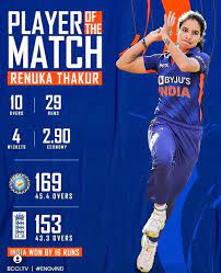 Charlotte Dean 47 रन बनाकर रन आउट हुई और अर्ध शतक बनाने से चूंकि। Renuka Singh ने शानदार गेंदबाजी करते हुए 10 ओवर में 29 रन देकर 4 विकेट लिए और Player Of The Match अवार्ड की दावेदार बनी।