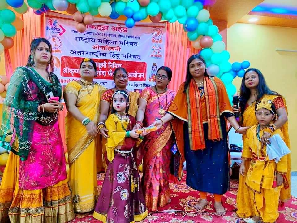 गया। अंतरराष्ट्रीय हिन्दू परिषद की महिला शाखा ओजस्विनी एवं राष्ट्रीय महिला परिषद की ओर से हर वर्ष की भाँति इस वर्ष भी श्रीकृष्ण जन्माष्टमी के शुभ अवसर पर “संगीत तथा नृत्य प्रतियोगिताओं” का आयोजन किया गया है इस कार्यक्रम की अध्यक्षता ओजस्विनी की गया जिला अध्यक्ष डॉ. रश्मि प्रियदर्शनी एवं राष्ट्रीय महिला परिषद की अध्यक्ष मधु शर्मा ने संयुक्त रूप से किया. तीन बार ओंकार के उच्चारण के उपरांत कार्यक्रम का शुभारंभ मुख्य अतिथि वार्ड पार्षद सारिका वर्मा, विशिष्ट अतिथि वरिष्ठ अधिवक्ता राखी कश्यप एवं कृष्णा नर्सरी, बोधगया की शिक्षिका सरिता सिन्हा, डॉ रश्मि प्रियदर्शनी, मधु शर्मा, शशिकांत मिश्र, प्रांत महामंत्री राष्ट्रीय बजरंग दल, मुक्तामणि, कार्याध्यक्ष, राम बारिक, विभाग महामंत्री, अहिप, मुकेश कुमार, जिला मंत्री, राष्ट्रीय बजरंग दल, अमीषा भारती, जिला मंत्री, ओजस्विनी, रजनी त्यागी, जिला संरक्षक, राष्ट्रीय महिला परिषद, सुनील बंबइया, सामाजिक कार्यकर्ता, आनंद जी ने संयुक्त रूप से दीप प्रज्ज्वलन करके किया है। श्रीकृष्ण को समर्पित भजन गाये गये. डॉ. रश्मि, मधु शर्मा एवं नीलम मिश्रा ने अतिथियों का स्वागत अंगवस्त्र प्रदान करके किया.तत्पश्चात रंग-बिरंगे परिधानों में श्रीकृष्ण, श्रीराधा और गोप-गोपियों का सलोना रूप धारण करके नन्हे-मुन्हे बच्चों ने संगीत एवं नृत्य प्रतियोगिताओं में कृष्णभक्ति में डूबे भजन, गीत, एवं मनभावन नृत्यों की प्रस्तुति दी है इस समारोह में नन्हे-मुन्हे बच्चे श्री कृष्ण भजन की मोहक धुन पर थिरक उठे। छोटे बच्चों ने श्रीकृष्ण के जीवन चरित्र पर प्रकाश भी डाला. प्रतियोगिता में राधिका को प्रथम, श्रद्धा को द्वितीय, पल्लवी एवं राघव को तृतीय स्थान प्राप्त हुआ है। सार्थक, सानु भास्कर, शशि सिन्हा, रुद्राक्ष, शारदा, राशि, हैप्पी, विभु, मनीषा, श्रुति व प्रिया की भी प्रस्तुति बड़ी ही सुंदर तथा मनहर रही.ओजस्विनी जिला अध्यक्षा डॉ. रश्मि प्रियदर्शनी व मंचासीन अतिथियों ने नन्हे-मुन्हे सभी विजेताओं और प्रतिभागियों को पुरस्कार प्रदान करके सम्मानित किया है। इस कार्यक्रम का संचालन ओजस्विनी की जिला मंत्री अमीषा भारती ने किया है।