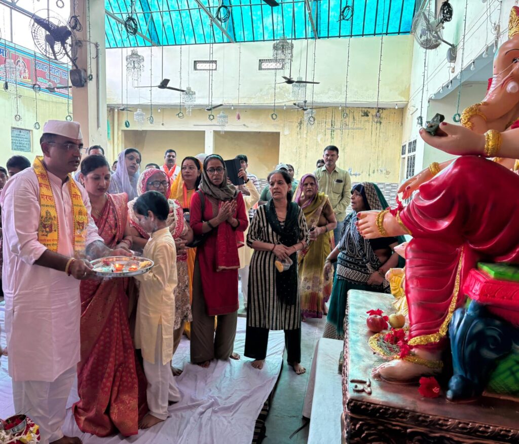 किरतपुर। श्री गणेश चतुर्थी के अवसर पर नगर में अग्रवाल धर्मशाला में श्री गणेश जी की प्रतिमा विराजमान की गई। गणपति की मूर्ति को सजाकर पंडाल सजाया गया। मुख्य यज्ञमान राष्ट्रीय स्वंय सेवक संघ के ललित राजपूत एंव उनकी पत्नी मोना राजपूत रही। बुधवार की सुबह गणेश चतुर्थी के उपलक्ष में अग्रवाल धर्मशाला में विधि विधान के साथ गणपति जी की पूजा अर्चना की गई। पंडित सूर्यदीप शर्मा ने पूजा संपन्न कराई। उसके बाद गणेश जी की आरती की गई। मुख्य यज्ञमान ललित राजपूत ने सनातन धर्म की एकता के लिए धार्मिक अनुष्ठानों में बढ़-चढ़कर भाग लेने का आह्वान किया। इस अवसर पर राजेश वर्मा, सोनू वर्मा, आकाश जैन मयंक अग्रवाल आलोक अग्रवाल, डाक्टर हेमेंद्र राजपूत, डाक्टर बरुण, मनोज वर्मा, विकास राजपूत, सचिन अग्रवाल, आदर्श कुमार, ऋतुज शर्मा, योगेन्द्र राजपूत आदि उपस्थित रहे।
