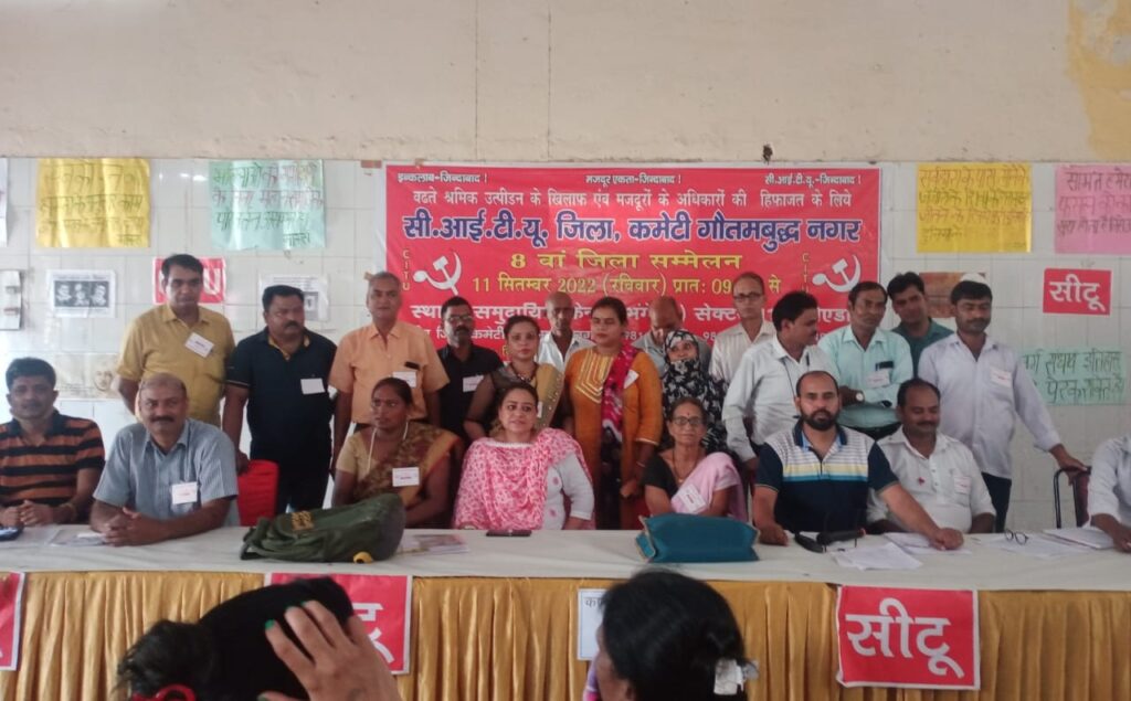 नोएडा । सीटू जिला कमेटी गौतमबुध्दनगर का त्रवार्षिक आठवां जिला सम्मेलन सामुदायिक केंद्र भंगेल सेक्टर- 110, नोएडा में 11 सितंबर 2022 को प्रातः 9:00 बजे सीटू जिलाध्यक्ष गंगेश्वर दत्त शर्मा द्वारा झंडारोहण किए जाने और सभी डेलीगेट साथियों द्वारा शहीद वेदी पर पुष्प चढ़ाकर विगत 3 वर्षों में हुए शहीदों एवं दिवंगत लोगों को 2 मिनट का मौन रखकर श्रद्धांजलि दिए जाने के साथ शुरू हुआ। सम्मेलन को सुचारू रूप से चलाने के लिए कॉमरेड गंगेश्वर दत्त शर्मा, लता सिंह, पूनम देवी तीन सदस्य अध्यक्ष मंडल का चुनाव किया गया।