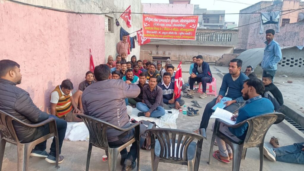 ग्रेटर नोएडा। सीटू जिलाध्यक्ष गंगेश्वर दत्त शर्मा के ऊपर हुए जान लेवा हमले के दोषियों पर कड़ी कार्रवाई एवं मौके पर मौजूद पुलिस कर्मियों को सस्पेंड करने की मांग को लेकर ट्रेड यूनियनों के संयुक्त आह्वान पर 17 जनवरी 2024 को जिलाधिकारी कार्यालय सूरजपुर ग्रेटर नोएडा पर होने वाले प्रदर्शन की तैयारी के लिए सीटू ने जनसंपर्क अभियान किया तेज, दादरी में श्रमिकों की सभा को संबोधित करते हुए सीटू जिला महासचिव रामसागर व उपाध्यक्ष मुकेश कुमार राघव ने बताया कि मैसर्स- मानिताऊ इक्यूपमेंट इण्डिया प्रा०लि०, प्लाट नं०-22 उधोग विहार, ग्रेटर नोएडा में वर्षों-वर्षो लगातार स्थाई रूप से कार्यरत 31 श्रमिकों को प्रबंधन द्वारा दिनांक 03.01.24 को कार्य से रोक दिया था। जिसके विरोध में प्रबंधन को सूचना देकर दिनांक 04.01.24 को संस्थान के मुख्य द्वार पर धरना शुरू किया गया।
