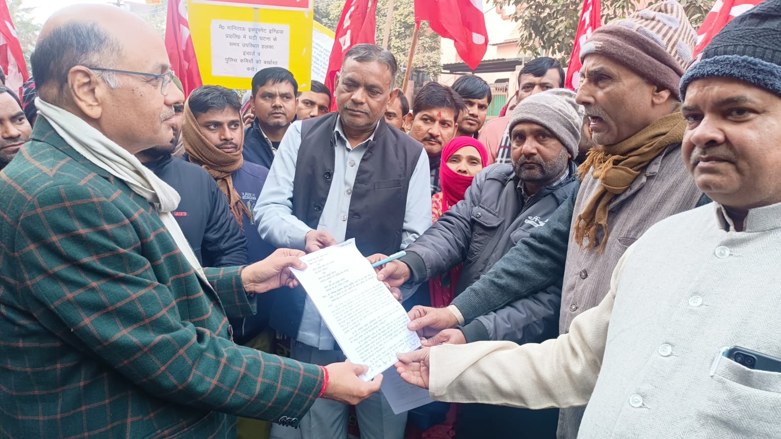 नोएडा। मानीताऊ कम्पनी पर 04 जनवरी 2024 को मजदूर नेता सीटू जिलाध्यक्ष गंगेश्वर दत्त शर्मा पर किए गए जानलेवा हमले के दोषी मैसर्स- मानिताऊ इक्यूपमेंट इण्डिया प्रा०लि०, प्लाट नं०-22 उधोग विहार, ग्रेटर नोएडा कम्पनी प्रबंधक व सहायक प्रबंधक, ठेकेदार, गुंडों एवं मौके पर मौजूद पुलिस कर्मियों के खिलाफ संगीन धाराओं के तहत मुकदमा दर्ज कर कड़ी कार्रवाई एवं नियम कानूनों का उल्लंघन कर दिए गए ठेकेदारी के लाइसेंस को रद्द कर, ठेके में लगे सभी श्रमिकों को कंपनी के रोल पर करवाने की मांग को लेकर 20 जनवरी 2024 को इंटक नेता- संतोष तिवारी, एटक – नईम,एचएमएस- आर०पी० सिंह, व रितेश कुमार झा, ऐक्टू – अमर सिंह, यूटीयूसी – नूर आलम, टीयूसीआई – उदय चंद्र झा् यूपीएलएफ – राम नरेश यादव, भालेयू – शेर सिंह, एसवीएस – विनोद कुमार, सीटू नेता राम सागर, रामस्वारथ, पूनम देवी, मुकेश कुमार राघव, राजकरण सिंह, इशरत जहां, जनवादी महिला समिति के नेता रेखा चौहान, गुड़िया देवी आदि के नेतृत्व में मजदूरों ने एडिशनल लेबर कमिश्नर/श्रम कार्यालय सेक्टर- 3, नोएडा पर प्रदर्शन कर माननीय मुख्यमंत्री उत्तर प्रदेश सरकार व श्रम आयुक्त और प्रमुख सचिव उत्तर प्रदेश सरकार को संबोधित ज्ञापन एडिशनल लेबर कमिश्नर श्री सरजू राम को सोपा, ज्ञापन पर बातचीत करते हुए ट्रेड यूनियन नेताओं ने उन्हें यह भी अवगत कराया कि यदि दिए गए ज्ञापन पर शीघ्र ठोस कार्रवाई नहीं होगी तो 16 फरवरी 2024 को जनपद में चक्का जाम हड़ताल की जाएगी जिसकी संपूर्ण जिम्मेदारी जिला प्रशासन, श्रम विभाग और प्रदेश सरकार की होगी।