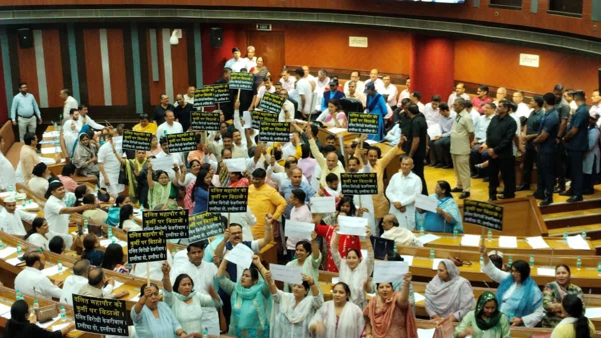 दिल्ली नगर निगम की बैठक शुरू होते ही हंगामा शुरू कर दिया गया, जिसमें तख्ती लेकर पहुचें भाजपा पार्षद वेल में आ गए और मेयर चुनाव की मांग को लेकर नारेबाजी शुरू कर दिए। भाजपा पार्षदों के हाथों में लिए तख्ती पर लिखा था “दलित महापौर को कुर्सी पर बिठाओ, दलित विरोधी केजरीवाल इस्तीफा दे दो। इसके अलावा आप पार्टी की राज्यसभा सांसद स्वाति मालीवाल के आरोपी को लेकर भी भाजपा पार्षदों ने नारेबाजी की।