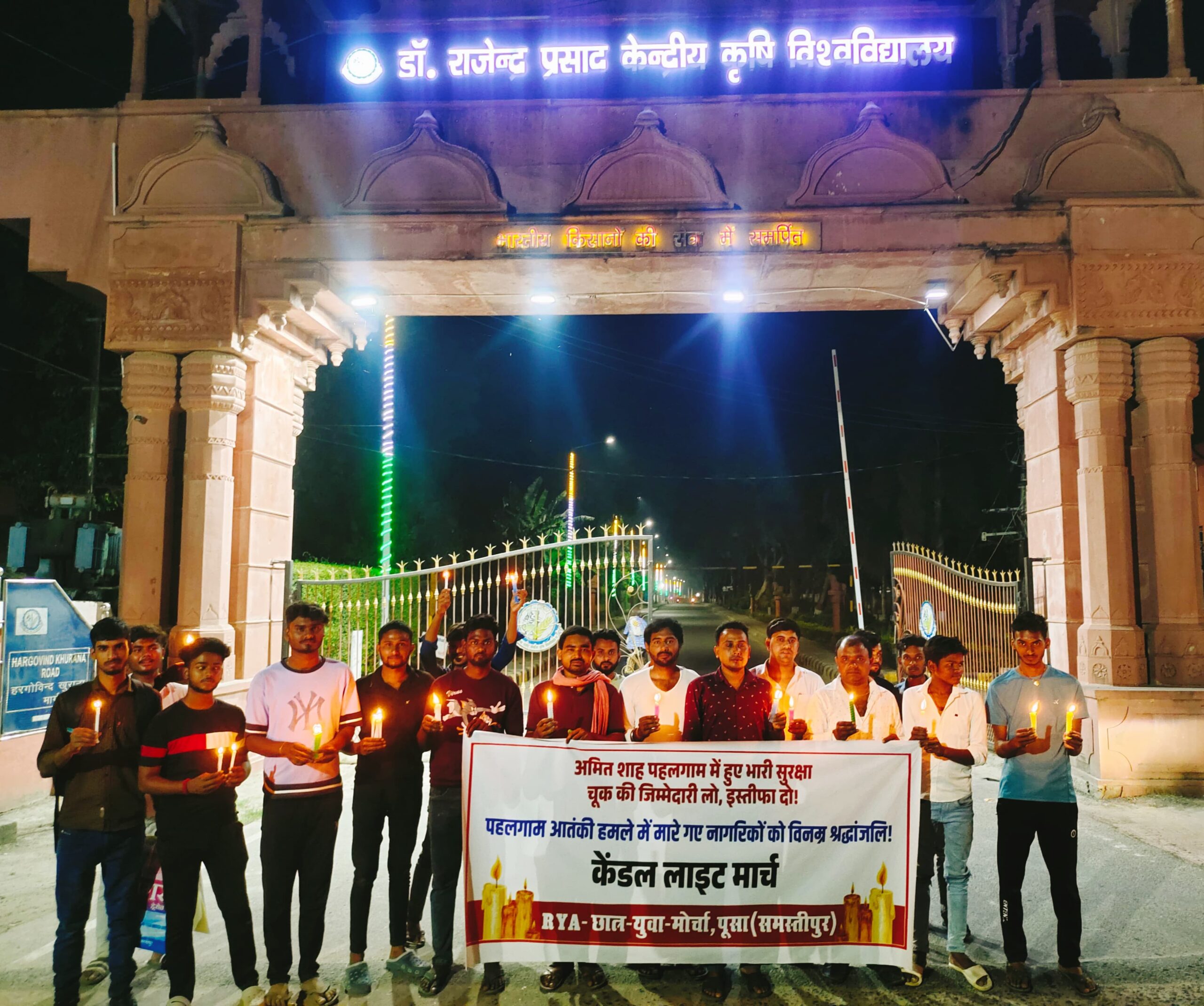 शनिवार देर शाम इंकलाबी नौजवान सभा “आरवाईए” के बैनर तले छात्र-युवा ने 22 अप्रैल को जम्मू & कश्मीर के पहलगाम में पर्यटकों पर हुए आतंकी हमले में 28 निर्दोष लोगों के मौत और कई के गंभीर रूप से घायल होने के खिलाफ पूसा हाई स्कूल मैदान से डॉ. राजेंद्र प्रसाद केंद्रीय कृषि विश्वविद्यालय परिसर में स्थित राजेंद्र प्रसाद जी के प्रतिमा तक कैंडल मार्च निकाल श्रद्धांजलि दिया साथ ही इस जघन्य घटना के दोषियों पर सख्त कार्रवाई की मांग की। कैंडल मार्च व श्रद्धांजलि सभा का अध्यक्षता आरवाईए जिला सचिव रौशन कुमार तथा संचालन युवा समाजसेवी बबलू यादव ने किया।