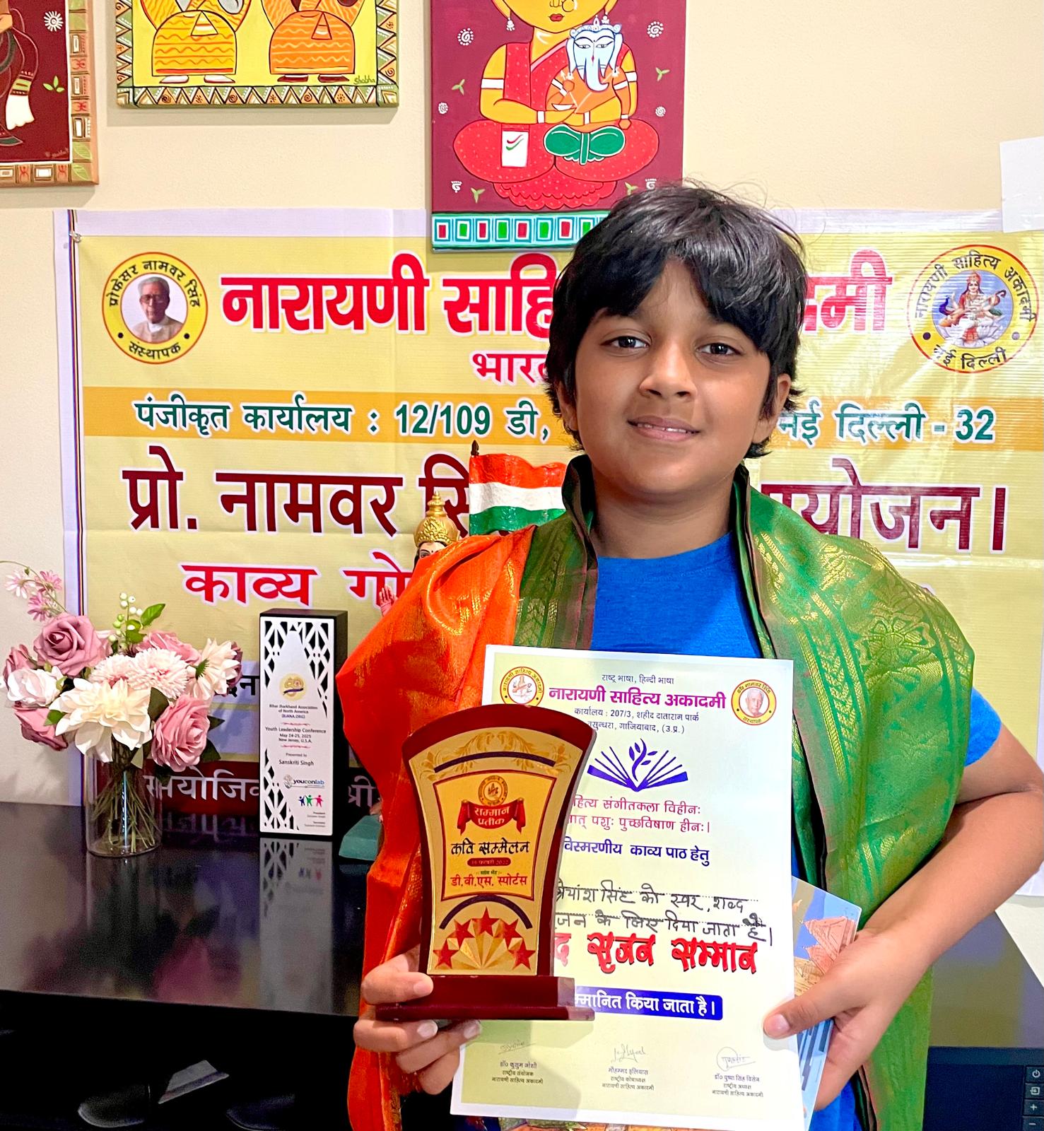 श्रेयांस में स्वर और सुर साधना की रुचि देखते हुए उन्हें संगीत की शिक्षा दी जा रही है।और वह अपने शब्दों को भी आकार देने में सक्षम हैं। नारायणी साहित्य अकादमी की राष्ट्रीय अध्यक्षा का प्रवास इस सप्ताह अमेरिका में रहा। भारतीय समिति के निर्णय से चयनित बाल कलाकार, सुर स्वर सृजनकार श्रेयांस को सम्मानित करते हुए अकादमी के सभी साहित्यकार, पदाधिकारी गण गौरवान्वित महसूस करते हैं। वहां उपस्थित कविता भार्गव जो अमेरिका में हैं और नारायणी साहित्य अकादमी की प्रवक्ता के पद पर हैं। श्रेयांस को इन दोनों मातृशक्ति ने उनके आवास पर जाकर सम्मानित किया।