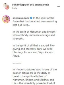 सोनम कपूर ने इस फोटो को शेयर करते हुए लिखा, ‘हमारी लाइफ में नई सांसे शामिल हो चुकी हैं। भगवान हनुमान और भीम के रूप में ये हमारी ताकत और हिम्मत का प्रतीक है। सभी से हम अपने बेटे वायु कपूर आहूजा के लिए आशीर्वाद चाहते हैं। हिंदू धर्म में वायु पांच तत्व में से एक हैं। वो वायु के देवता हैं। हनुमान, भीम और माधव के आध्यात्मिक पिता हैं और वो हवा के शक्तिशाली भगवान हैं।’