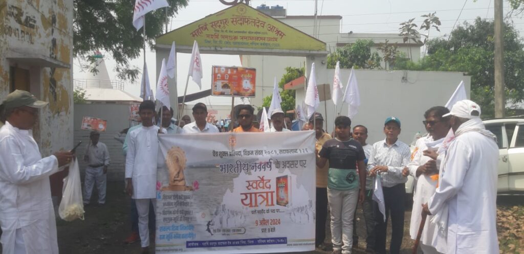 जामुड़िया : सद्गुरु सदाफल देव विहंगम योग संस्थान द्वारा देश के विभिन्न क्षेत्रों में हिंदू नव वर्ष के अवसर पर स्वर्वेद शोभायात्रा निकाली गयी। इसी क्रम में सद्गुरु सदाफल देव निंघा आश्रम परिसर से मंगलवार की सुबह स्वर्वेद शोभायात्रा निकाली गई। शोभायात्रा गाजे-बाजे के साथ आश्रम से शुरु होकर निंघा इलाके की परिक्रमा करते हुए वापस आश्रम में आकर समाप्त हुई। इस दौरान महिलाओं ने माथे पर सद्गुरु सदाफल देव जी महाराज द्वारा रचित स्वर्वेद को रखा एवं अन्य महिलाओं एवं पुरुषों ने हाथ में ‘अ’ अंकित श्वेत ध्वजा लिए हुए थे।