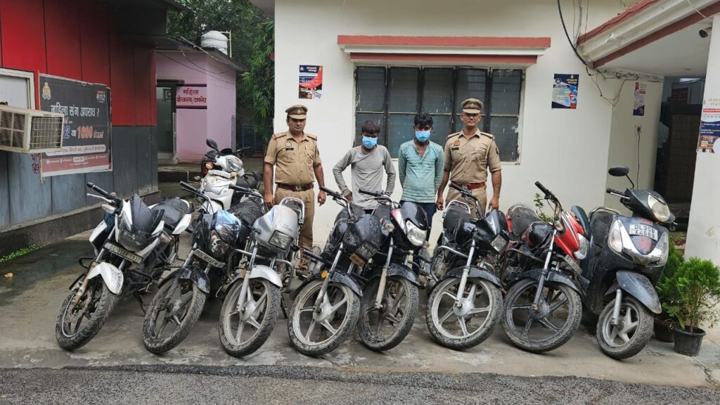 नोएडा। दो शातिर बदमाशों को थाना सेक्टर-39 नोएडा पुलिस ने गिरफ्तार कर लिया है। इन बदमशों के कब्जे से पुलिस ने चोरी की 7 मोटर साईकिल, एक 1 स्कूटी व एक तंमचा समेत अन्य सामान बरामद किया है।