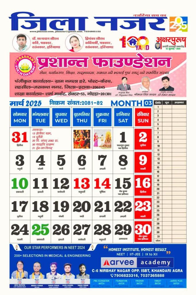 आगरा/हिसार। हिन्दी भाषा और लेखन के क्षेत्र में समर्पित लेखकों का मान-सम्मान करना आज के समय में दुर्लभ हो गया है, जहाँ अधिकतर लोग सम्मान के नाम पर व्यावसायिक लाभ उठाने में लगे हैं। ऐसे में ‘ज़िला नज़र’ पत्रिका के संपादक संत कुमार भारद्वाज ने एक प्रेरणादायक पहल की है। उन्होंने वर्ष 2025 के कैलेंडर में प्रसिद्ध लेखक डॉ. सत्यवान सौरभ और प्रियंका सौरभ के चित्रों को उनके नाम सहित शीर्ष पर प्रकाशित कर एक विशेष सम्मान प्रदान किया है। इस अद्वितीय पहल के अंतर्गत, ‘ज़िला नज़र’ की ओर से हजारों प्रतियाँ निशुल्क वितरित की गई हैं, जो न केवल आगरा और उत्तर प्रदेश, बल्कि देश के अन्य हिस्सों में भी लोगों तक पहुँची हैं। इस सम्मान से अभिभूत दोनों लेखकों ने अपनी ख़ुशी व्यक्त करते हुए ‘ज़िला नज़र’ टीम का हार्दिक आभार व्यक्त किया है।